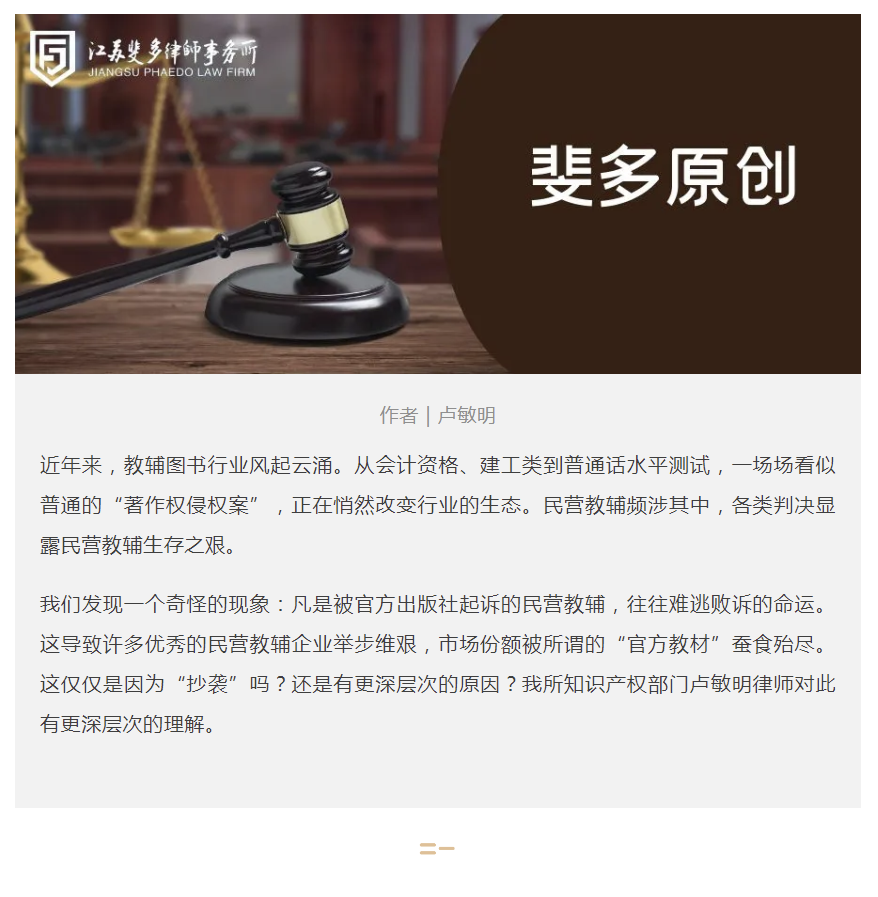 当下,随着教辅行业的快速发展,越来越多的民营图书企业开始编纂考试类教辅图书,从2020年开始,经济科学出版社作为“官方教材”的出版社开始大面积起诉民营图书企业著作权侵权,并获得胜诉判决 ,后来越来越多的“官方教材”出版社开始进行批量维权诉讼,如中国建筑出版传媒有限公司(俗称建工社)、应急管理出版社有限公司、中国计划出版社有限公司、中国财政经济出版社等陆续就“官方教材”向民营图书企业主张侵权诉讼并获得支持。起初,被诉侵权图书的出版社作为唯一被告,并未积极应诉,也未对侵权案件进行全面抗辩,因为其与民营图书企业有出版合同,出版合同都会明确侵权赔偿全部由民营图书企业承担,故被诉图书的出版社并不会在意侵权诉讼进展,导致前期诉讼大量高额判决。但随着越来越多的民营企业重视自身图书研发,并组建自身的编写团队,委托众多业内教授、专家出面编纂教辅图书,此类侵权案件的出现势必会影响教辅行业的发展,并且已经出现“官方教材”垄断整个市场的苗头,本人在深入研究教辅图书案件后,发现所谓的“官方教材”的权利来源在各行政部门,且在各类教辅图书案件中,各官方出版社均将“官方授权”文件作为权属证据提交,这就涉及教辅图书案背后是否涉及行政性垄断事宜。