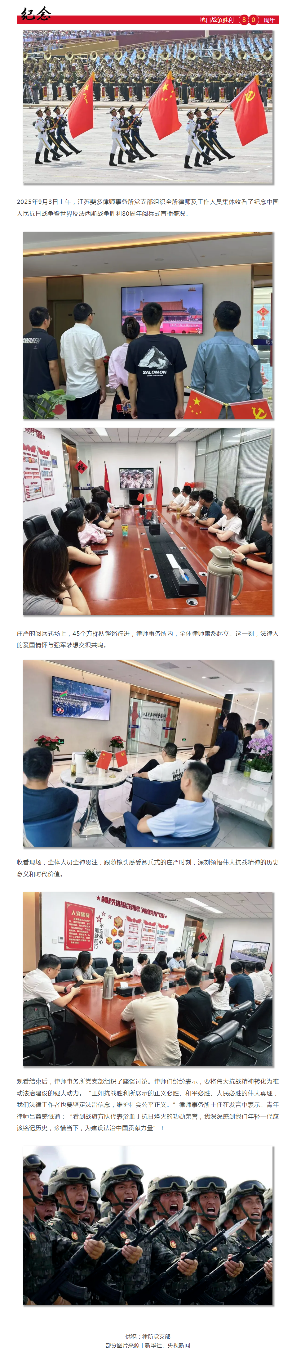 江苏斐多律师事务所党支部组织集体收看抗战胜利80周年阅兵式 弘扬爱国主义精神