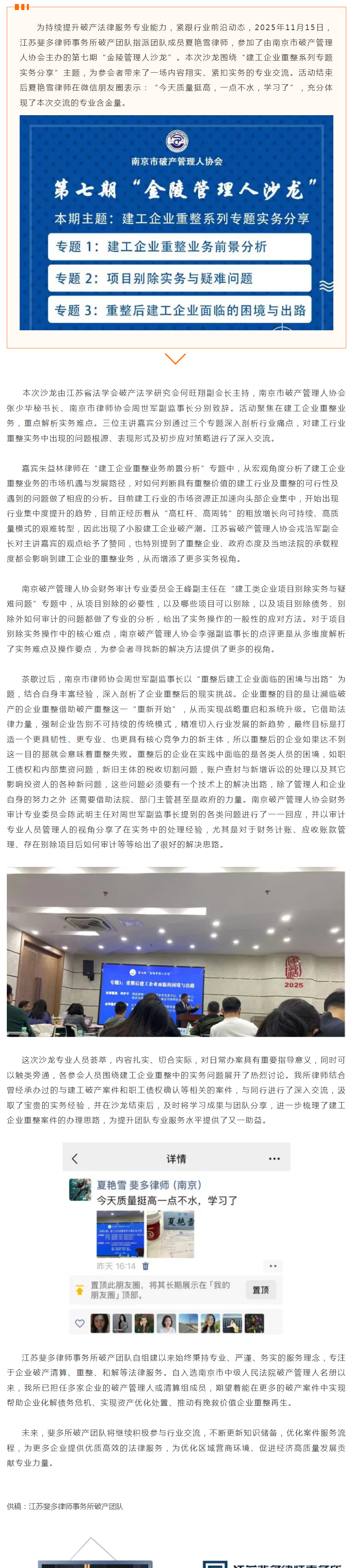 斐多资讯 | 我所破产团队成员参与第七期金陵管理人沙龙活动