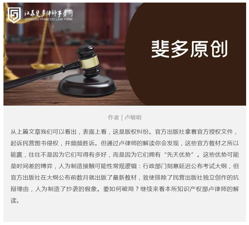 (5)对于民营图书企业,由于教辅图书的特性,决定了其不可避免的须引用相关术语、公式、法律法规及规范性文件等;同时,为了满足应试人员需求,方便其复习备考,教材结构体系及内容范围必然需遵循考试大纲进行编排。因此,从整体结构看,诸如案涉两书目录及每节内容中的一级标题等内容,虽然涉案两书的上述内容构成相同,但该些内容亦与对应的考试大纲内容基本一致,故属于应试教辅类书籍中不可避免使用到的有限表达。但官方出版社却恰巧利用了考试的有限表达,大量主张侵权诉讼。
