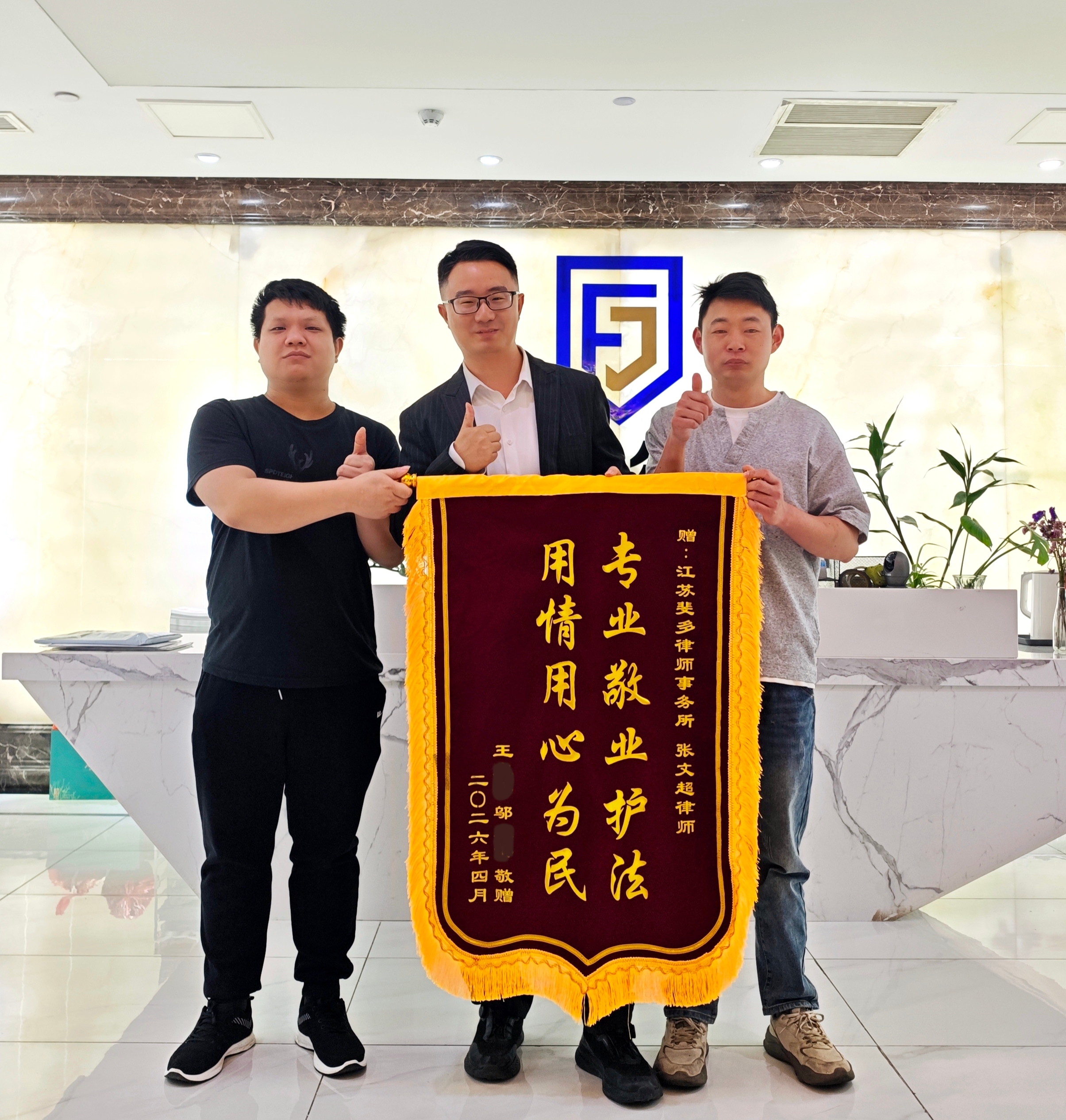 2026年4月19日,当事人王先生与邬先生专程来到江苏斐多律师事务所,将一面印有“专业敬业护法,用情用心为民”的锦旗,郑重赠予我所张文超律师,以表达对江苏斐多律师事务所及张文超律师的由衷感谢。